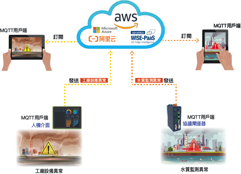 - 支援主流雲平台(亞馬遜AWS/微軟Azure/阿里雲/研華WISE-PaaS)